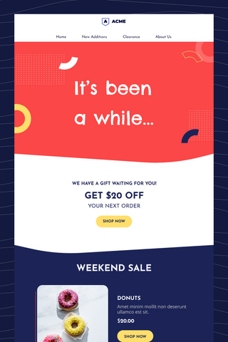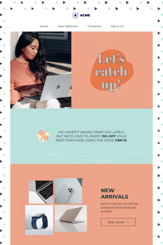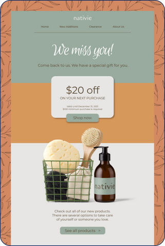 Winback emails will send to customers who've purchased previously, but haven't made a purchase for at least 3-6 months. Best practice is to introduce these customers to your newly arrived products and offer a small discount.